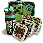 Minecraft 5 Piece Lunch Set Kids School Lunch Bag, 450ml Lockable Water Bottle, 3 Nesting Snack Boxes Featuring Cr...